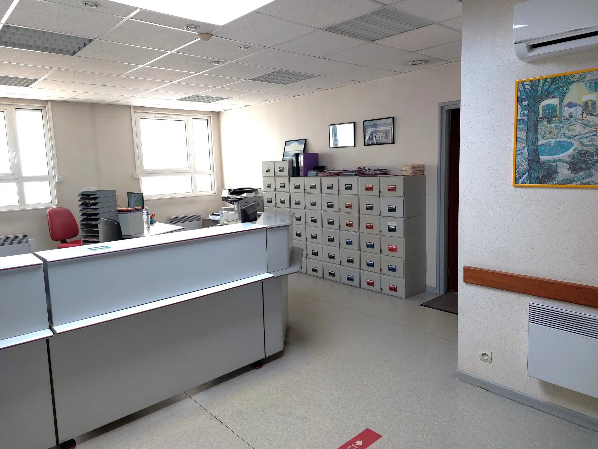 Il comprend une salle d’accueil, une salle d’attente, deux bureaux offrant un espace de travail fonctionnel et confortable, 4 pièces types bureaux à exploiter selon vos besoins, des sanitaires, une salle de repos et une grande réserve de 37m² pouvant faire office de pièce de stockage/ réserve.