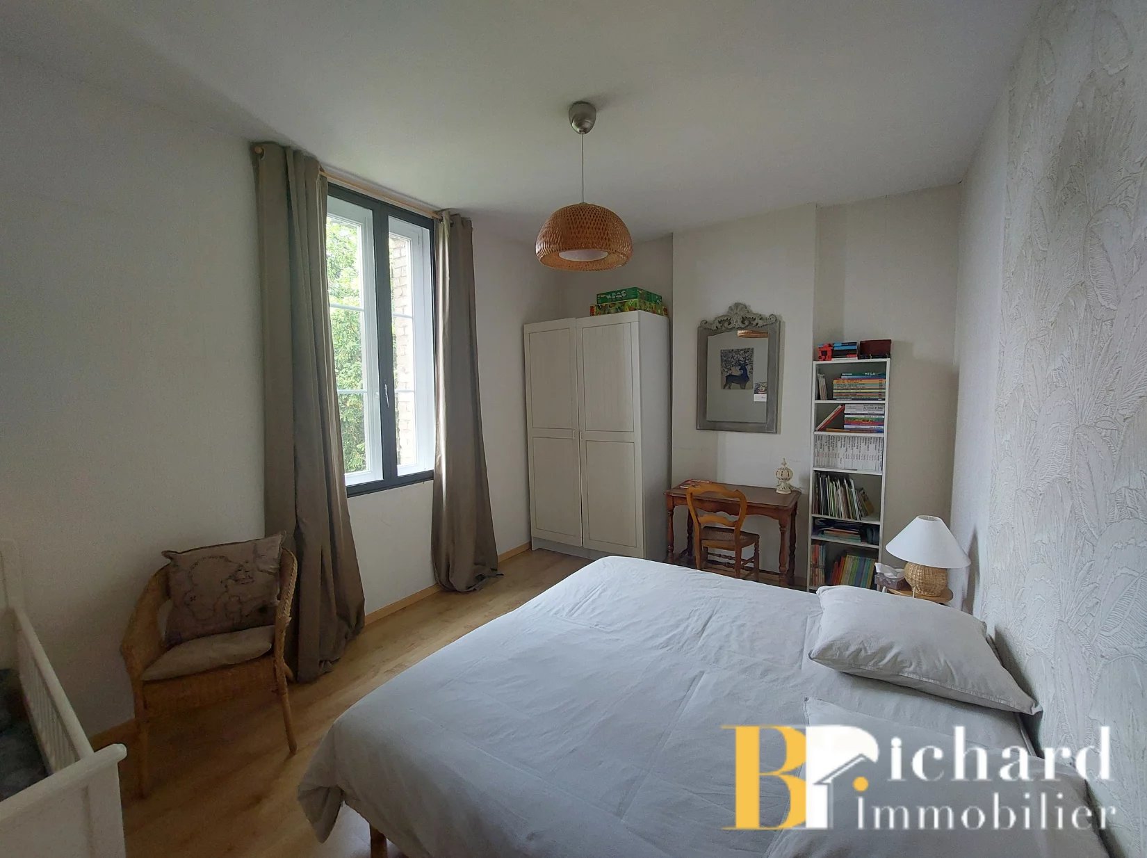 Elle se compose d’une entrée ouvrant sur un vaste séjour lumineux de 30 m² avec cheminée, offrant une vue dégagée sur le jardin. La cuisine est indépendante, aménagée et équipée. L’espace nuit propose quatre chambres, une salle de bain et des sanitaires séparés.